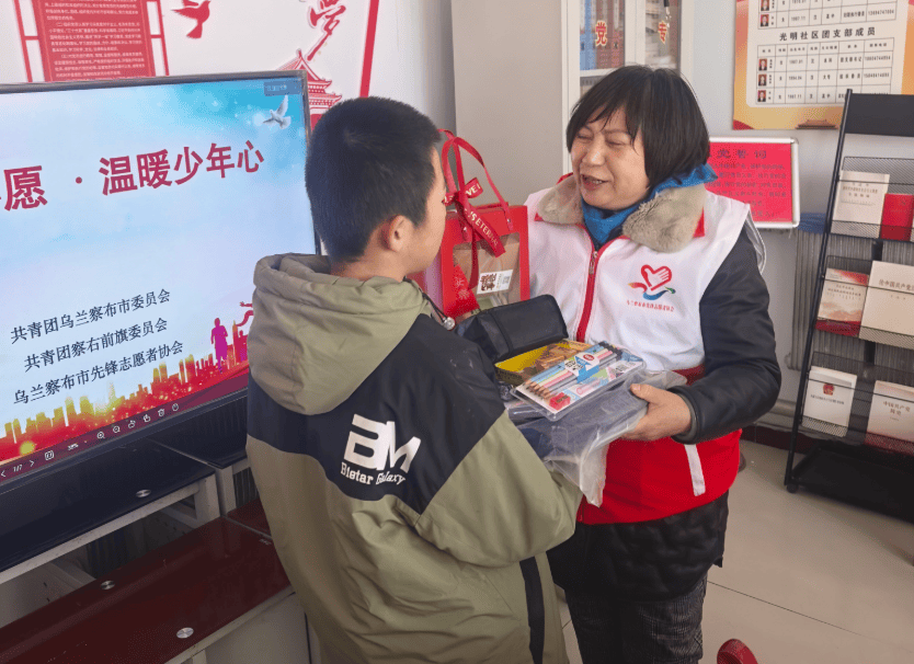 为深入贯彻落实习总书记关于志愿服务的重要指示精神,做好春节期间青少年关心关爱工作,充分传递党的关怀和温暖,2月2日上午,乌兰察布市先锋志愿者协会携手共青团乌兰察布市委员会、共青团察右前旗委员会联合主办的“志愿耀北疆 携手暖冬行”点亮微心愿公益活动在察右前旗土贵乌拉镇光明社区举办。