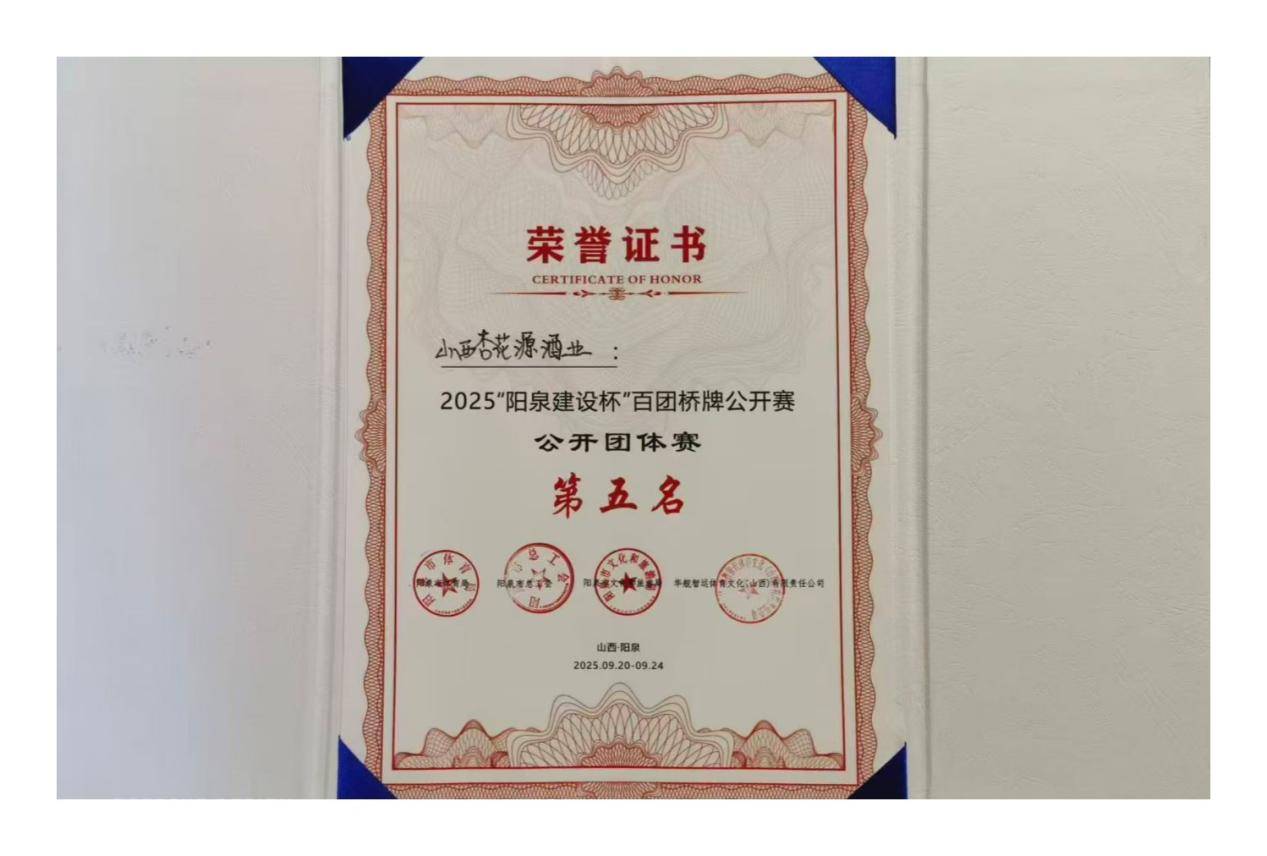 山西杏花源酒业代表队在比赛中始终保持稳健发挥。从小组赛的积分积累到淘汰赛的强强对决,队员们以严密的战术布局、精准的局势判断和无缝的团队协作,接连突破强敌阻击。面对复杂牌局时沉着冷静,遭遇压力挑战时默契补位,既展现了高超的竞技素养,更诠释了“智谋与协作共生”的桥牌精神,最终在激烈角逐中锁定第五名的优异成绩。“这份成绩是团队合力的见证,更是对坚持与专注的回报。”代表队队长表示,参赛不仅是技艺的切磋,更在“赛事+文旅”的独特氛围中感受到了阳泉的城市魅力,也让更多人了解到杏花源酒业对智力运动的支持与热爱。
