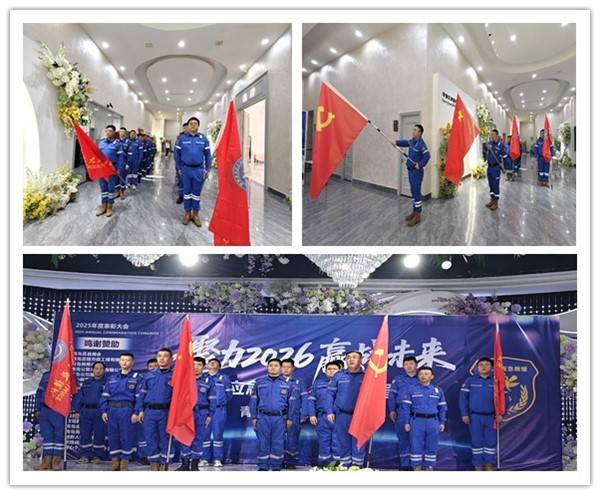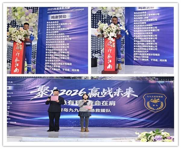 公益在线山东讯(记录者李法明)华灯初上,暖意融融。1月25日晚,城阳印象江南大酒店宴会厅内流光溢彩,气氛热烈而庄重。以“聚力2026·赢战未来”为主题的青岛九九五应急救援队2025年度年会在此隆重举行。,蓝焰主题的背景板在灯光下熠熠生辉,象征着救援队守护平安的坚定信念。空气中弥漫着温馨与感动,全体队员、爱心人士代表及队员家属代表欢聚一堂,共同见证这一荣耀时刻。 活动伊始,身着蓝色救援队服的队员们精神抖擞,列队步入会场。队列前方,队员高举中国共产党党旗、中国国旗及九九五应急救援队队旗步伐铿锵,口号嘹亮。旗帜在灯光下猎猎飘扬,与队员们坚毅的神情交相辉映彰显团队的政治信仰与救援宗旨,展现了应急救援人员的专业素养与昂扬风貌。
