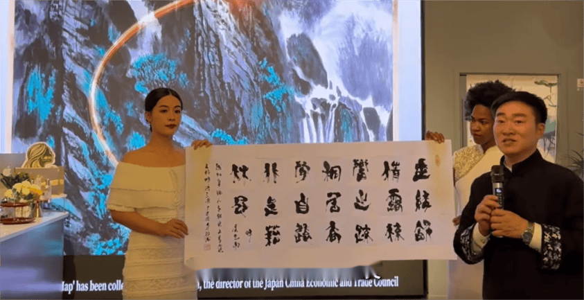 联命国网合集团总裁Andy Lin先生 现场艺术创作环节将活动气氛推向高潮。在古筝与竹笛的悠扬伴奏中,王余根博士以独特的左手握笔姿态凝神挥毫,时而笔走龙蛇演绎独创的“人意”书法,时而泼墨晕染勾勒山水意境,每一个笔触都牵动着现场观众的目光,直观展现了东方艺术的灵动气韵与磅礴气势。嘉宾们驻足品鉴,或围绕藏品细节向王余根博士咨询交流,或探寻《哈佛蓝梦》《游张家界》等作品的创作故事,现场洋溢着浓厚的文化交流氛围。