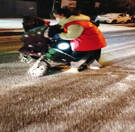 就在扫雪工作有条不紊推进时,暖心的一幕在小区内悄然上演。社区网格员刘香玲、牛彩虹正埋头清扫路面,突然听到“哎呀”一声惊呼。两人循声望去,只见一位骑电动车的居民因路面湿滑不慎摔倒,车子歪倒在一旁,居民挣扎着想要起身,却因腿部疼痛难以动弹。