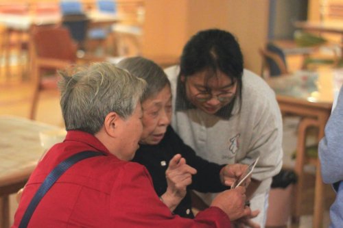 活动现场,温馨氛围从学子们递出爱心礼物的那一刻便悄然蔓延。当看到自己的照片时,老人们脸上洋溢着惊喜与感动。一位98岁的张婆婆抚摸着照片感慨道:“这张照片拍得真好,谢谢孩子们还记得我们!”随后,志愿者们围坐在老人身边,耐心倾听他们讲述过往岁月、家庭故事和生活趣事,老人们反复叮嘱志愿者“在学校要好好照顾自己”并相互约定“下次见”,一来一往间满是跨越年龄的温情互动。