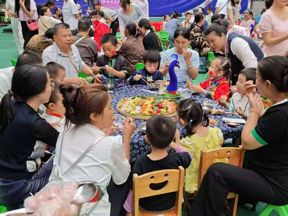 美食体验区的傣族 “孔雀宴” 则成为全场焦点。翠绿芭蕉叶铺就的长桌上,紫糯米塑成的孔雀头颈栩栩如生,鸡枞菌丝模拟的尾羽层次分明,36 片炸春卷插成扇形尾屏,青柠片、菠萝块、傣味虾等食材按色谱渐变排列,宛如孔雀开屏般绚烂。“这是妈妈和我一起摆的‘羽毛’!” 孩子们牵着家长的手,用指尖轻点美食,在品尝酸甜鲜香的同时,了解傣族人 “以食敬自然” 的文化传统。家长王女士坦言:“这样的亲子互动太有意义了,孩子记住了芭蕉叶的清香,更懂得了各民族文化的贵。”