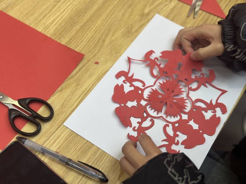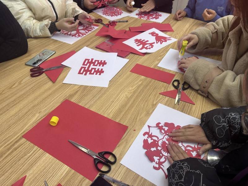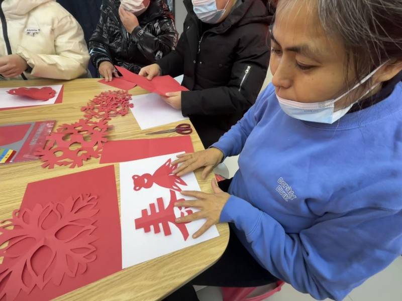 红纸翻飞,剪刀轻舞,活动现场暖意融融、热闹非凡。一张张普通的红纸,在大家的巧手下变成了一幅幅寓意吉祥的作品,每一幅作品都饱含着大家对新年的美好憧憬。大家围坐在一起,相互交流、分享技巧,活动现场处处洋溢着欢乐和谐的氛围。不一会儿,一张张普通的红纸变成了寓意吉祥的福字、一张张精致的窗花,不仅是大家巧手创作的成果,更承载着大家对美好生活的期许。