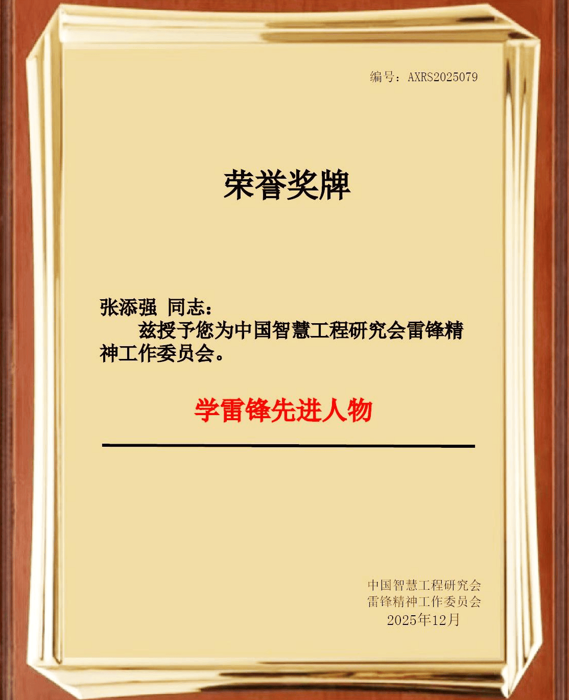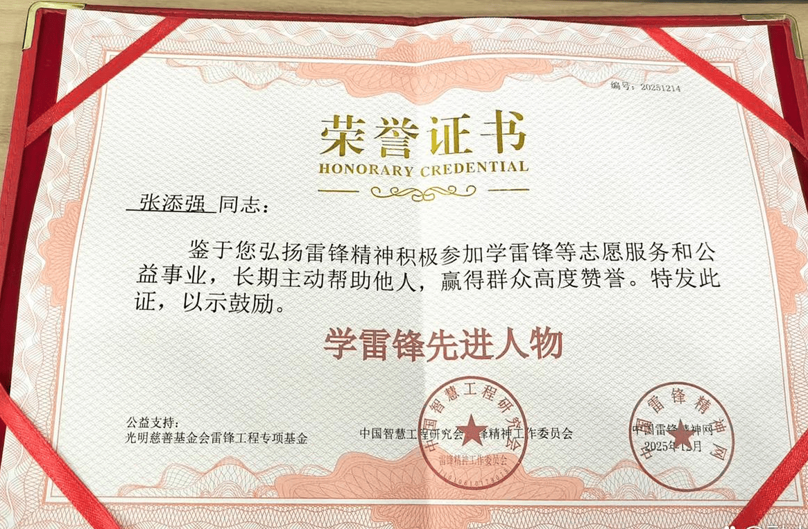 近日,在光明慈善基金会雷锋工程专项基金的支持下,由中国智慧工程研究会雷锋精神工作委员会与中国雷锋网联合主办的评选活动中,经多方评审一致决定:授予张添强同志“学雷锋先进人物”荣誉称号。